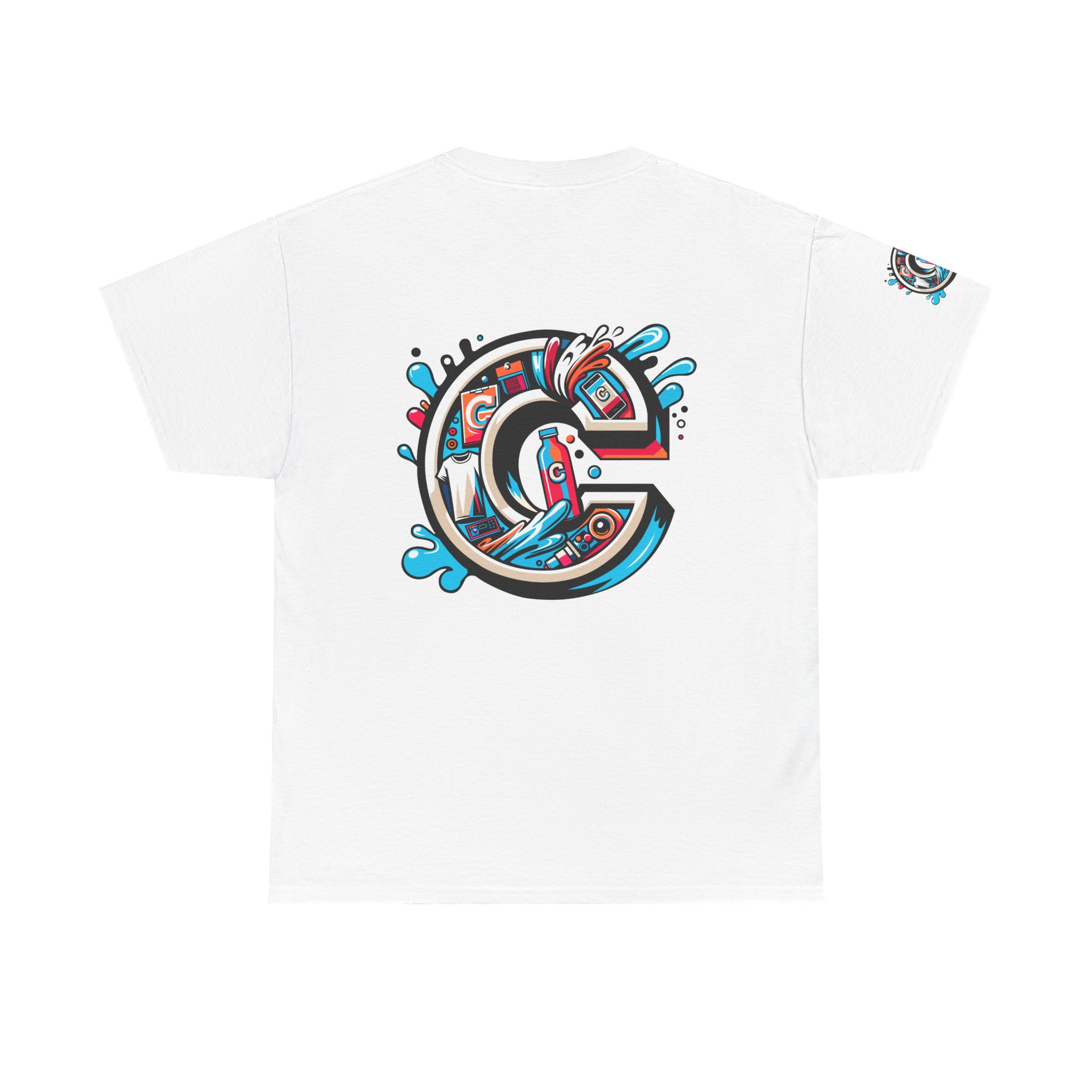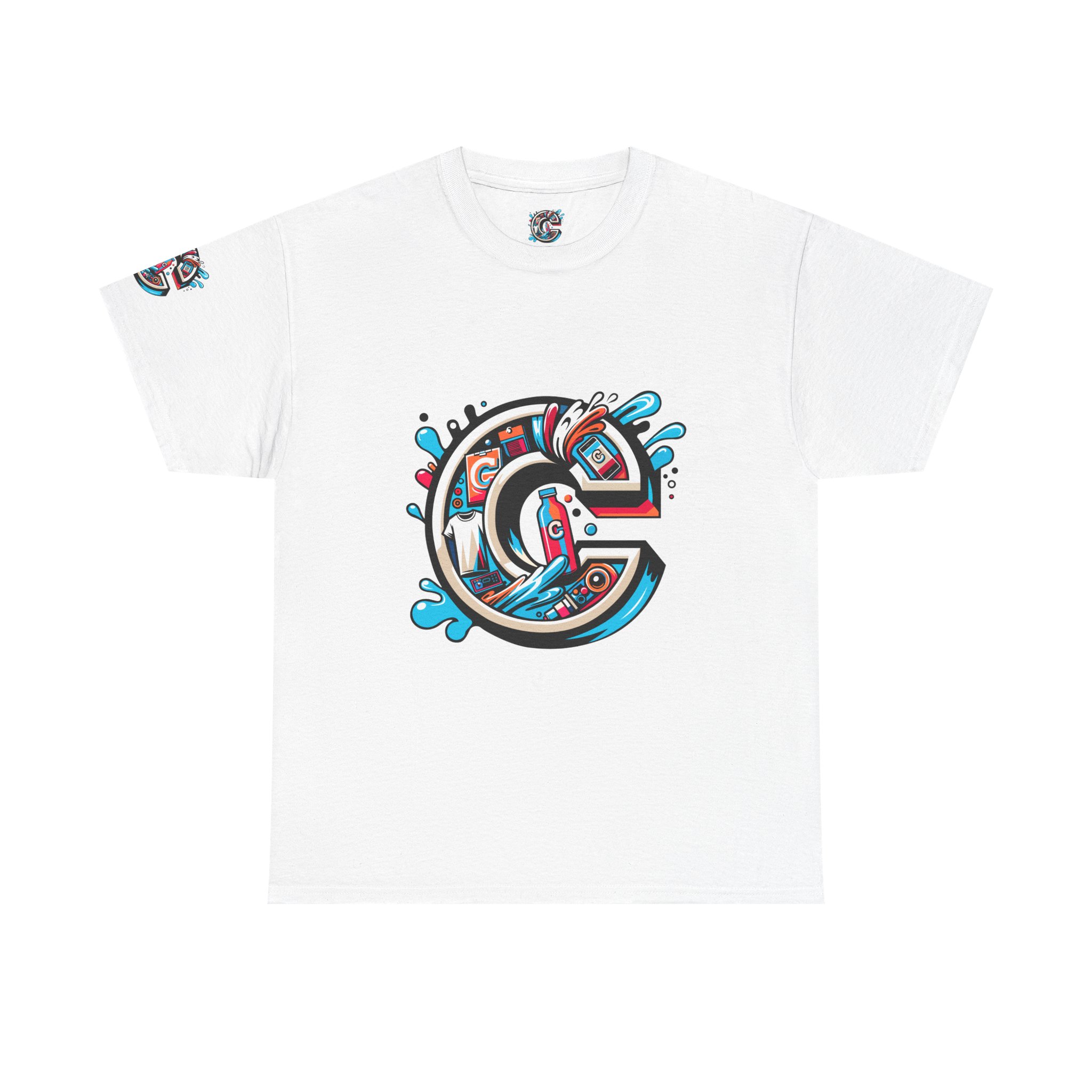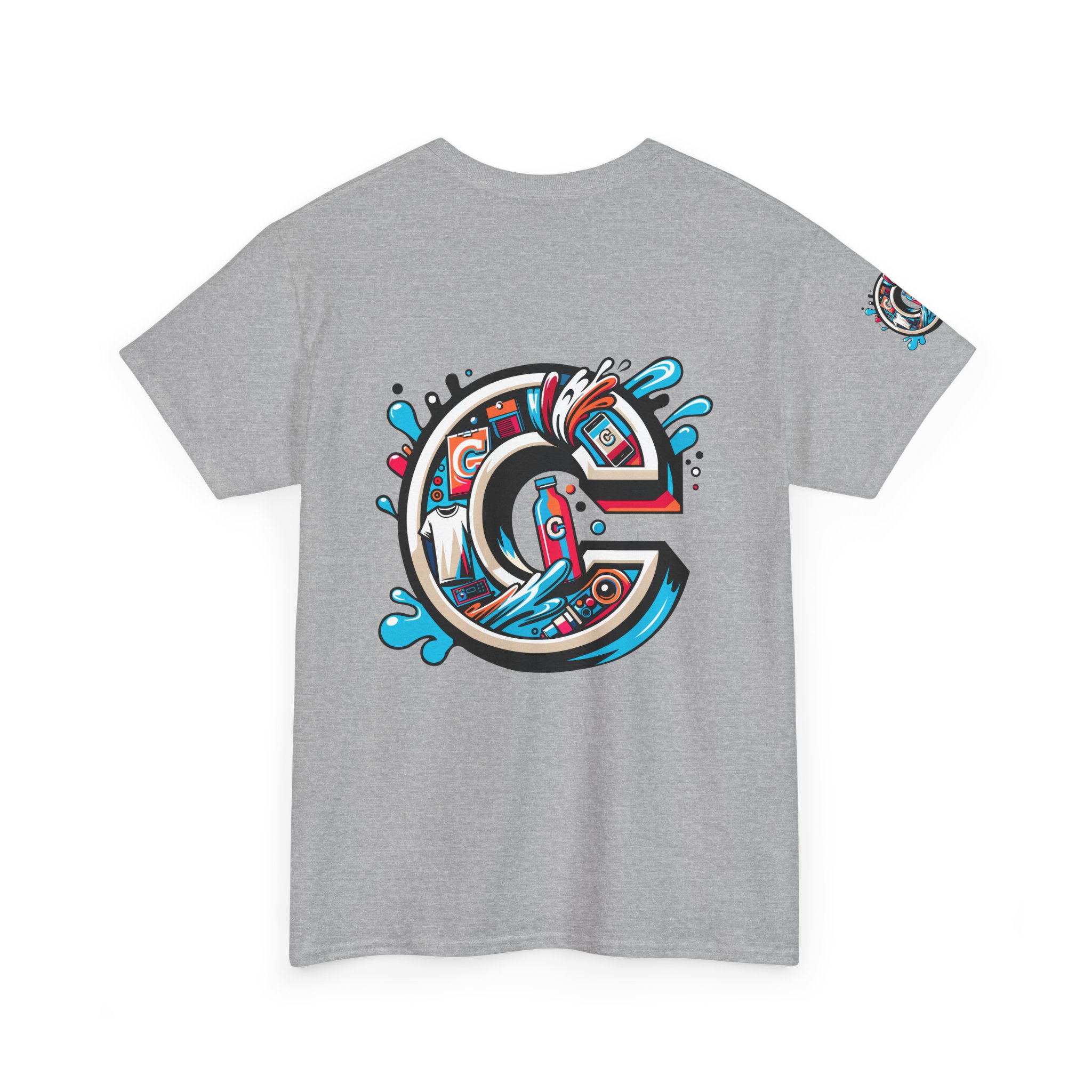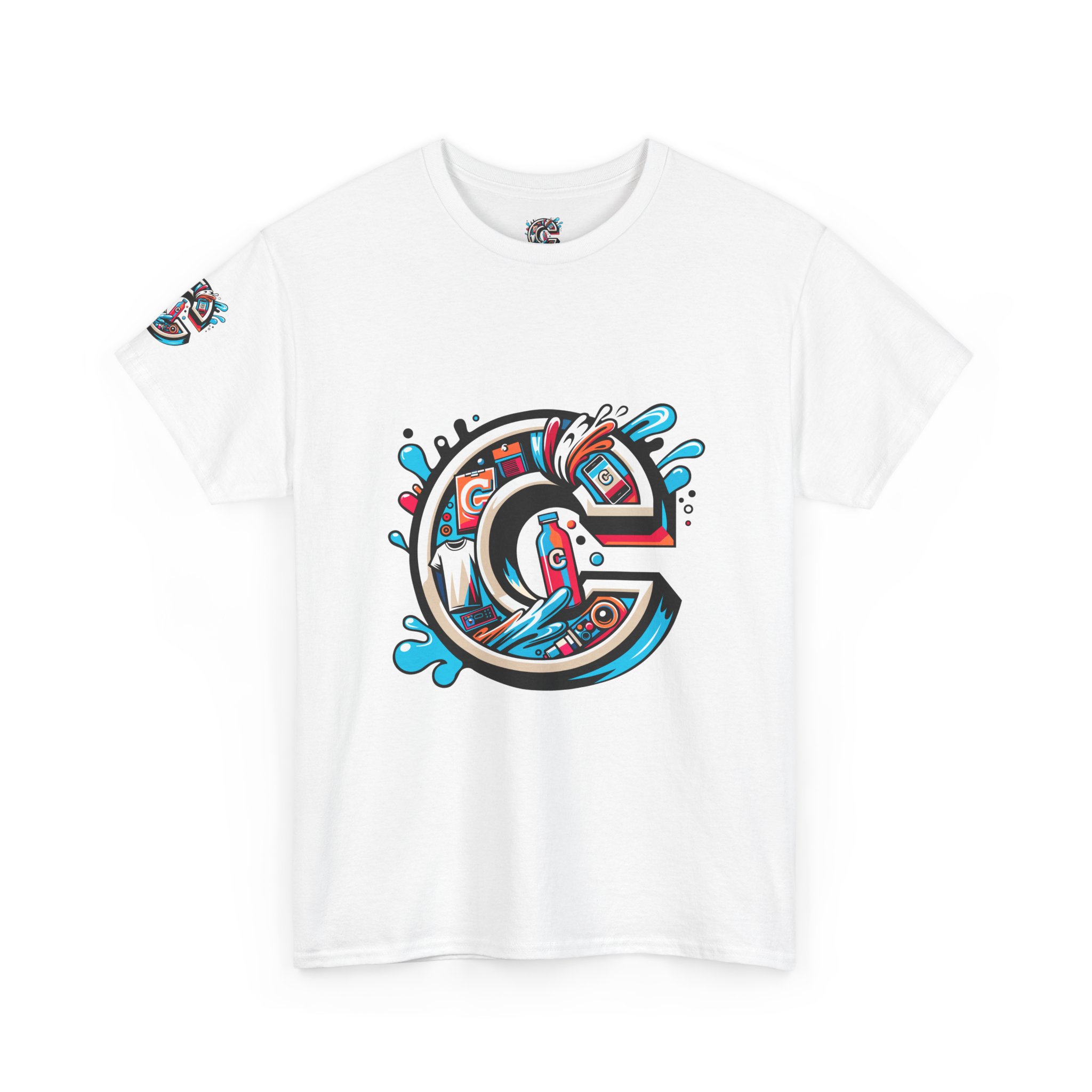 This 100% cotton tee carries bold, street-art energy—an illustrated, splash-filled letter C sits centered on the chest and mirrored larger on the back, while smaller badge illustrations land on each sleeve. The artwork mixes clean vector edges with painterly splashes and a limited palette of cyan, magenta and black, giving it a dynamic, skate-culture vibe. The classic crew shape and medium-weight fabric make it wearable year-round; the tubular knit and shoulder tape keep the silhouette tidy after many washes. Wear it to loosen up a layered outfit, rep a local crew, or bring a pop of color to a skate sesh or city stroll. The tear-away label and soft ribbed collar mean it feels as good as it looks.