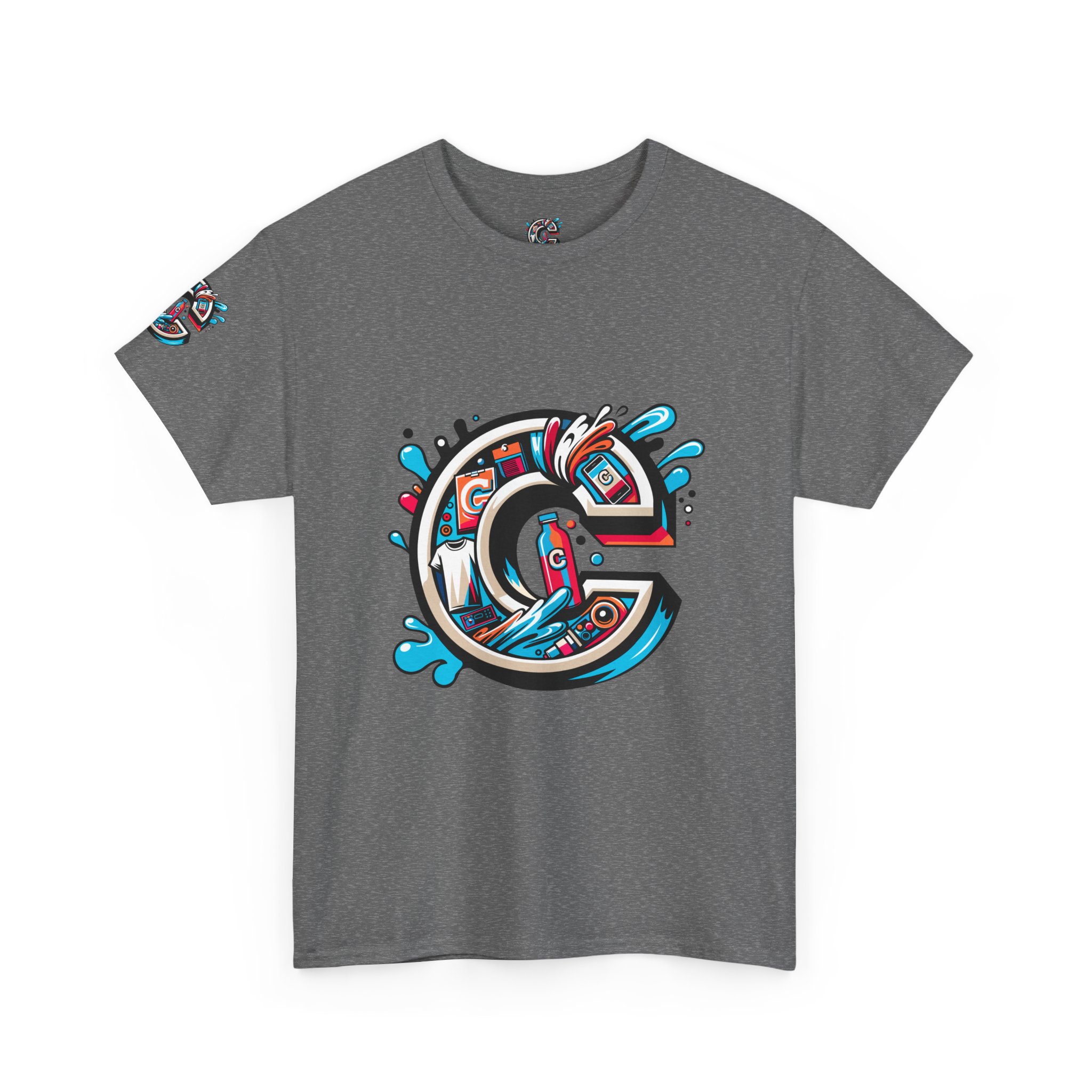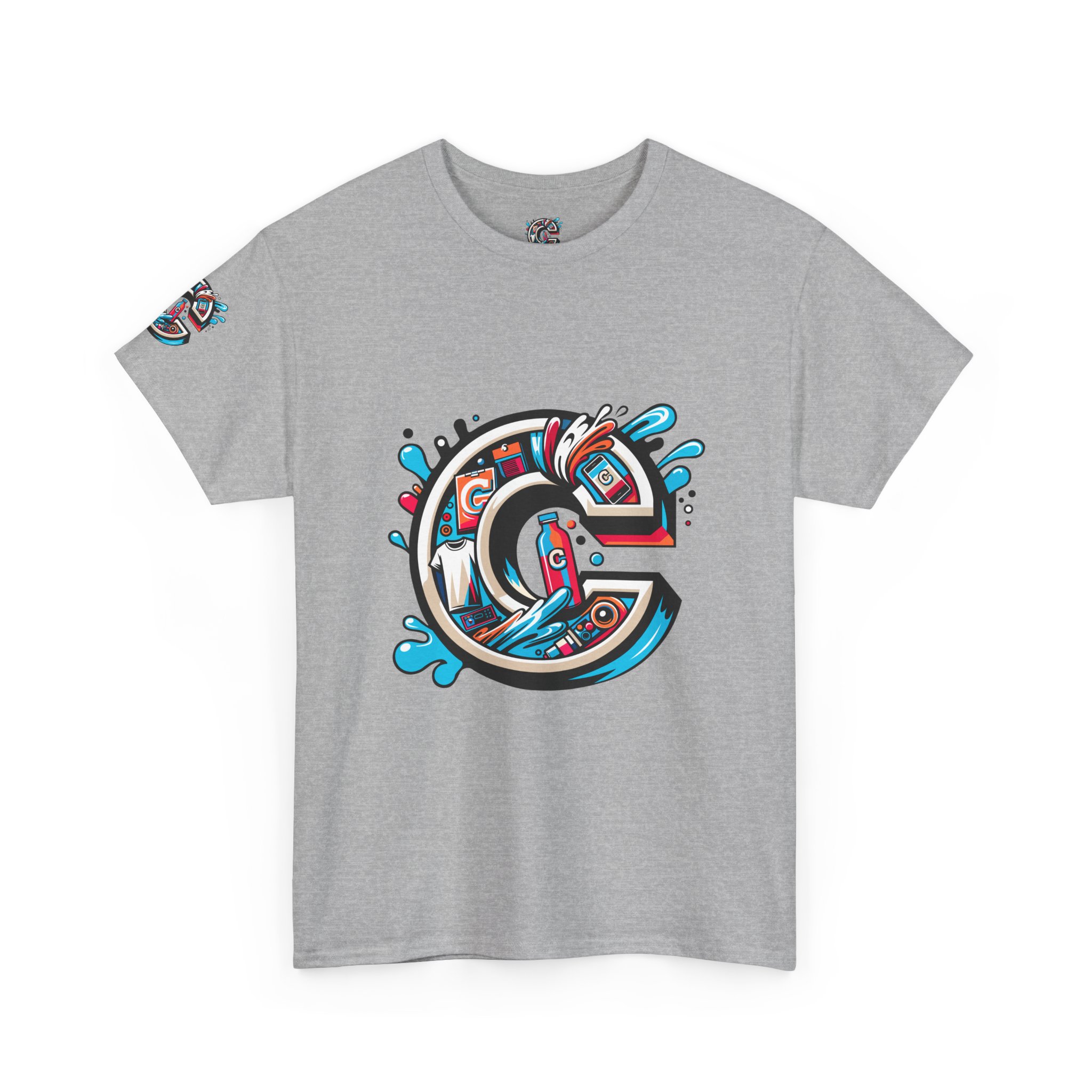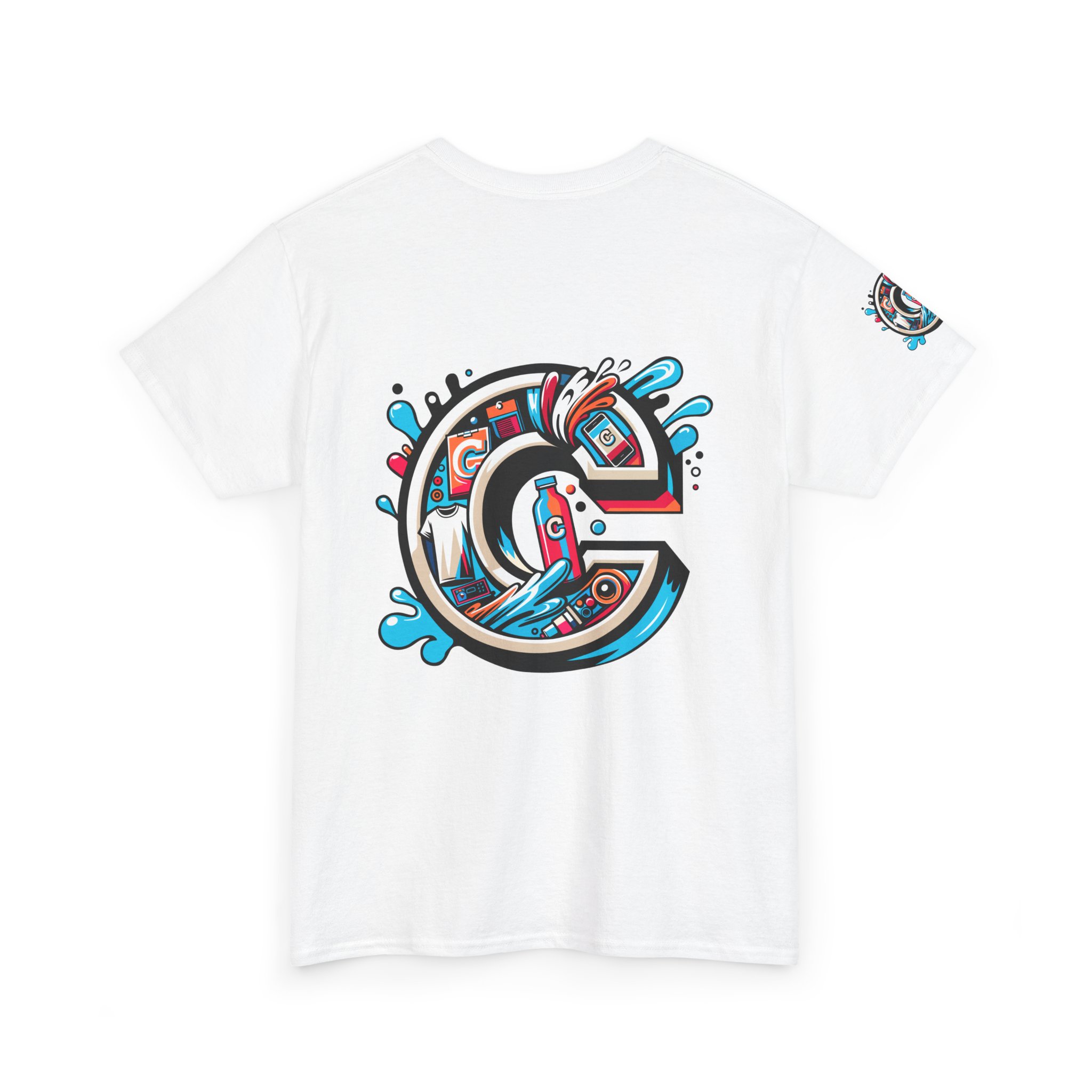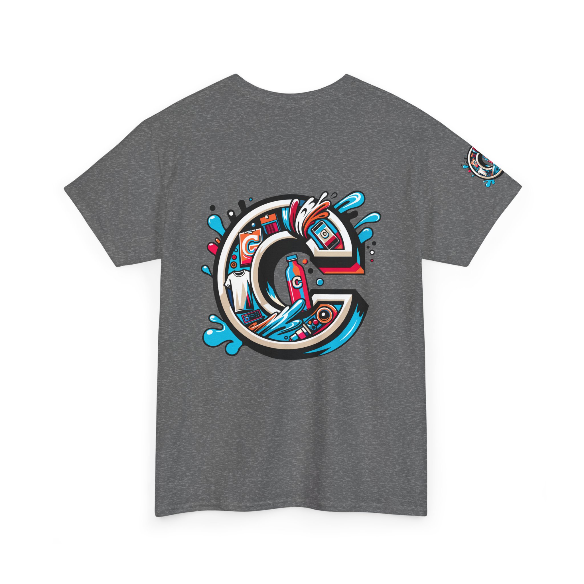 This 100% cotton tee carries bold, street-art energy—an illustrated, splash-filled letter C sits centered on the chest and mirrored larger on the back, while smaller badge illustrations land on each sleeve. The artwork mixes clean vector edges with painterly splashes and a limited palette of cyan, magenta and black, giving it a dynamic, skate-culture vibe. The classic crew shape and medium-weight fabric make it wearable year-round; the tubular knit and shoulder tape keep the silhouette tidy after many washes. Wear it to loosen up a layered outfit, rep a local crew, or bring a pop of color to a skate sesh or city stroll. The tear-away label and soft ribbed collar mean it feels as good as it looks.