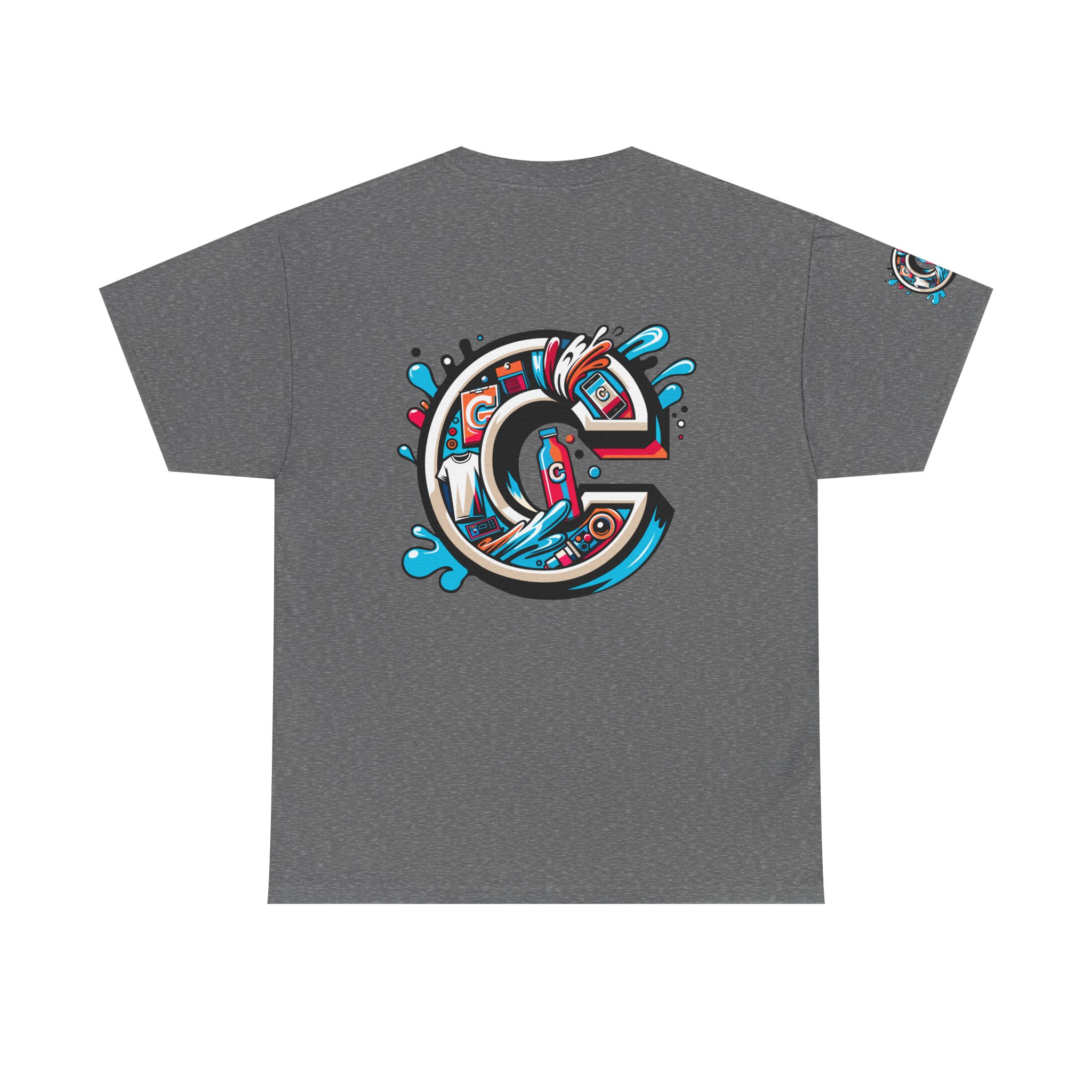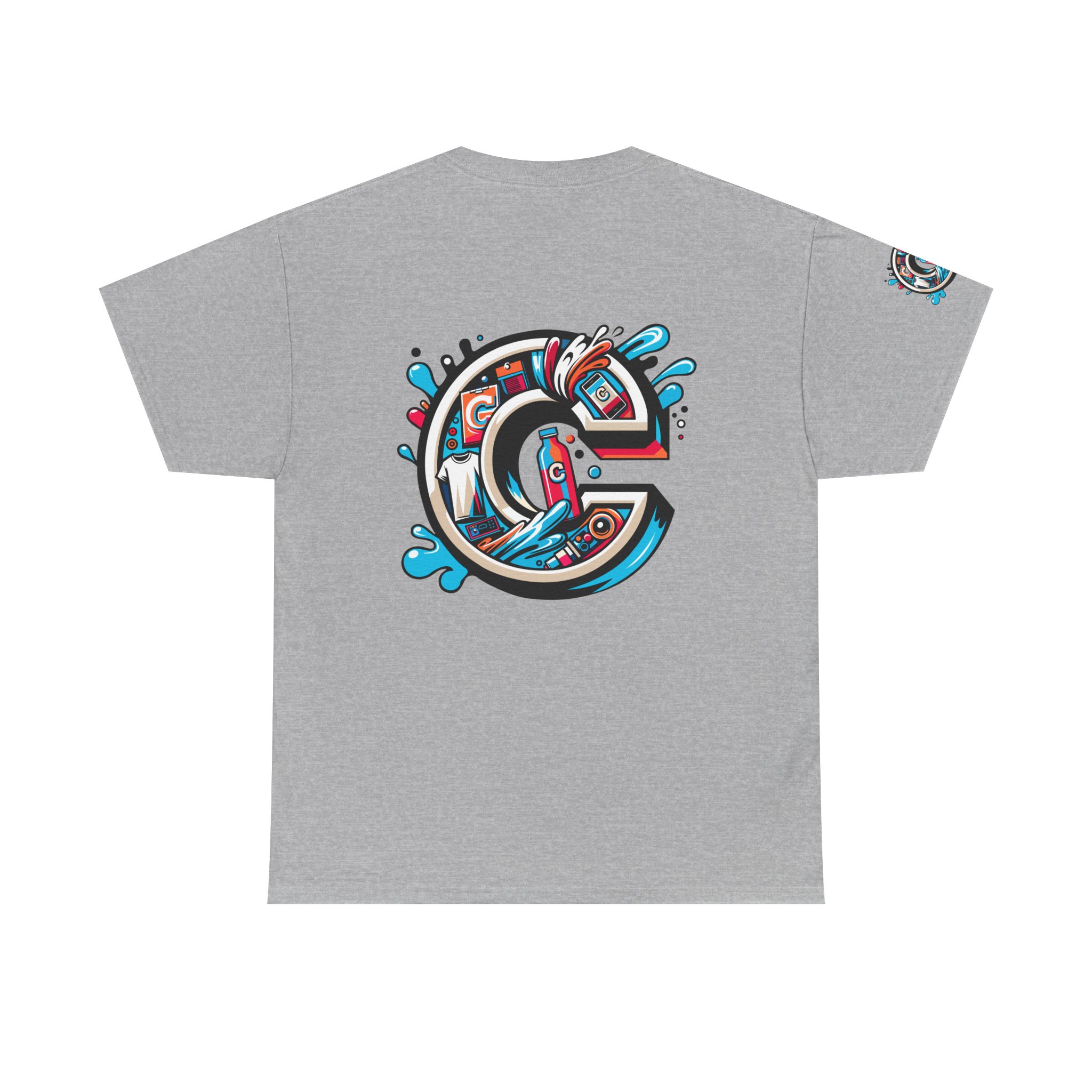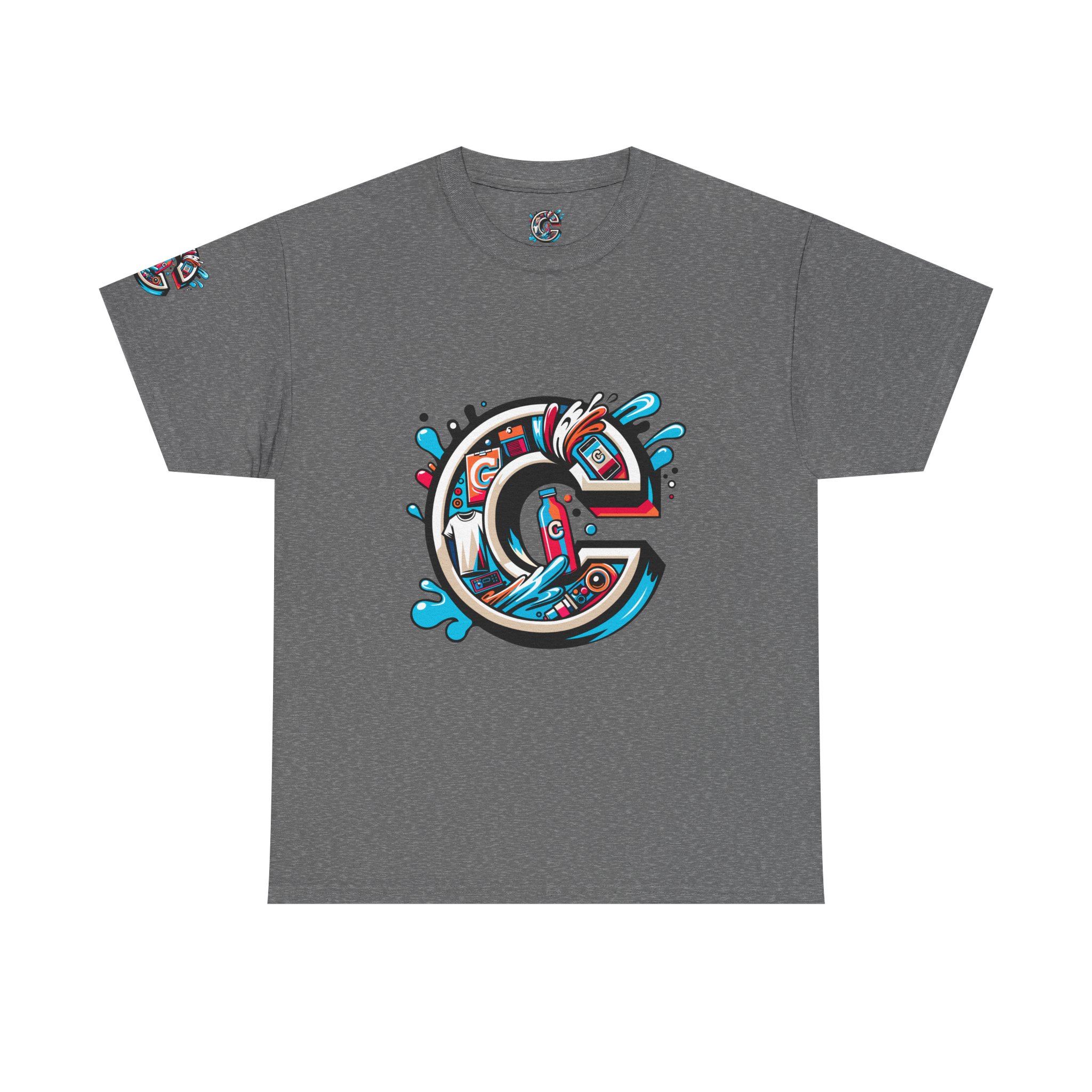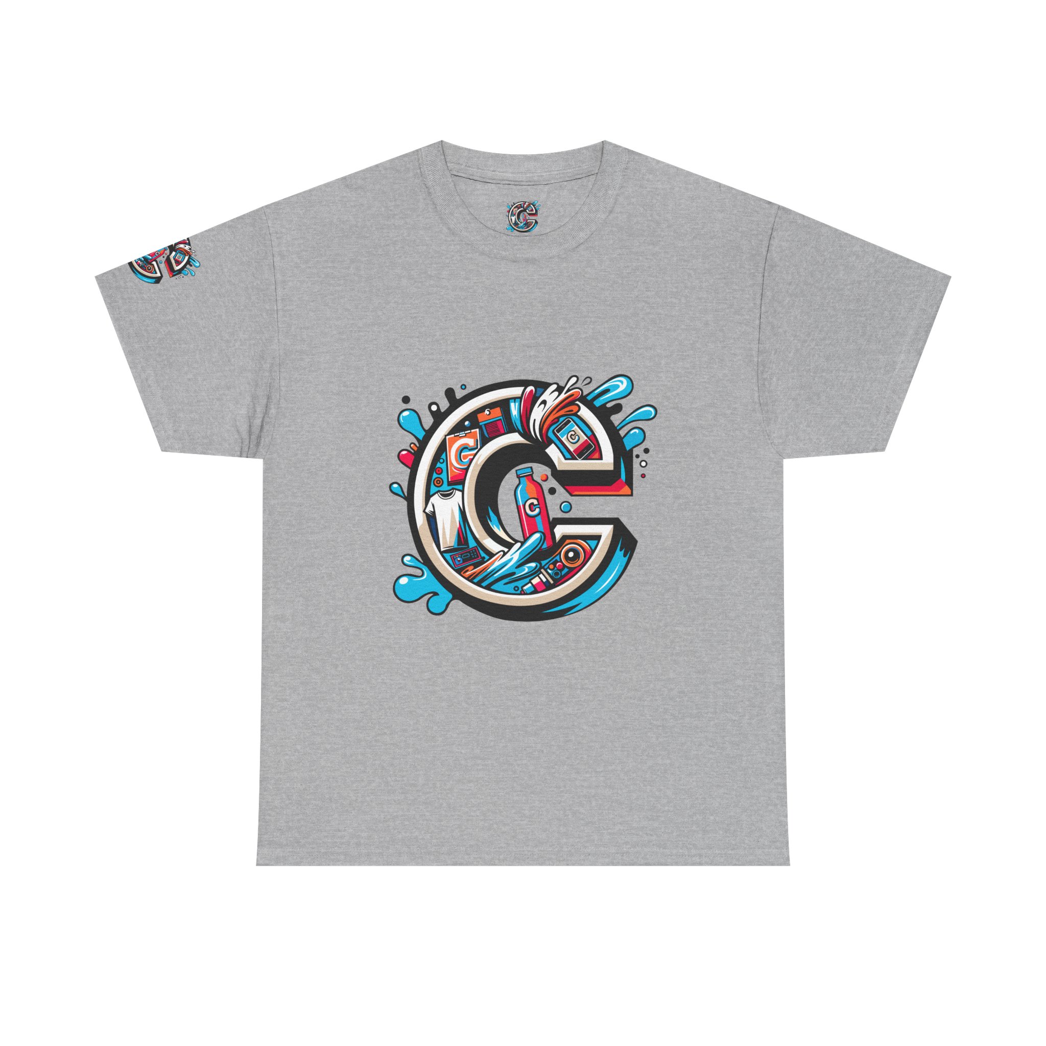 This 100% cotton tee carries bold, street-art energy—an illustrated, splash-filled letter C sits centered on the chest and mirrored larger on the back, while smaller badge illustrations land on each sleeve. The artwork mixes clean vector edges with painterly splashes and a limited palette of cyan, magenta and black, giving it a dynamic, skate-culture vibe. The classic crew shape and medium-weight fabric make it wearable year-round; the tubular knit and shoulder tape keep the silhouette tidy after many washes. Wear it to loosen up a layered outfit, rep a local crew, or bring a pop of color to a skate sesh or city stroll. The tear-away label and soft ribbed collar mean it feels as good as it looks.